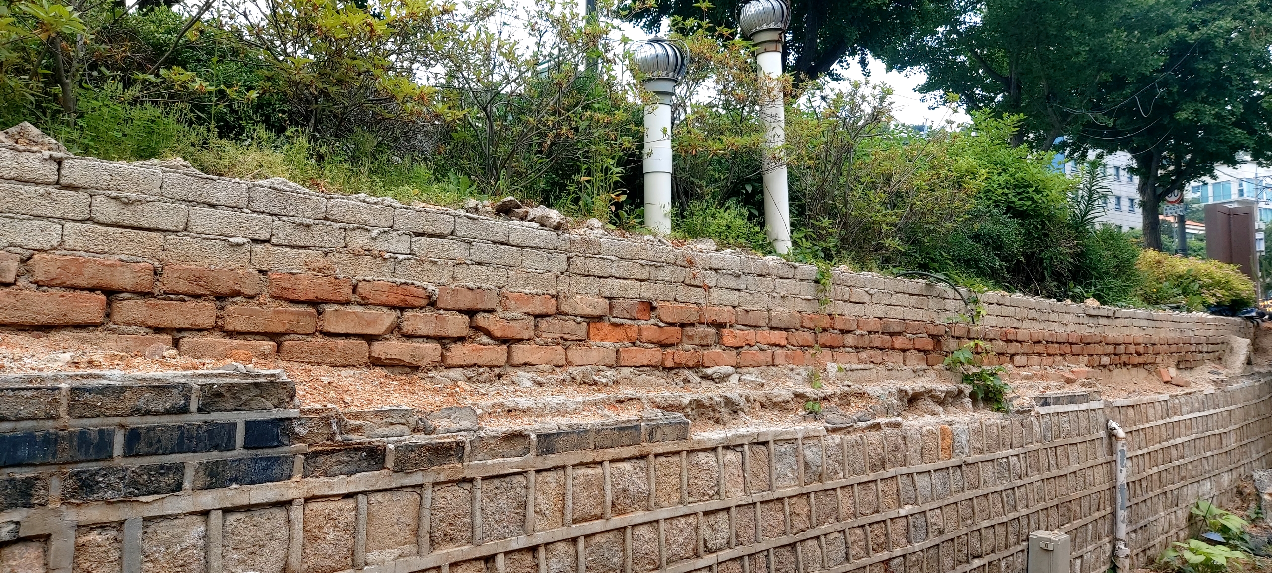 담장은 돌과 벽돌, 흙이 층층이 맞물려 있는 구조라 단순히 새 벽돌을 끼워