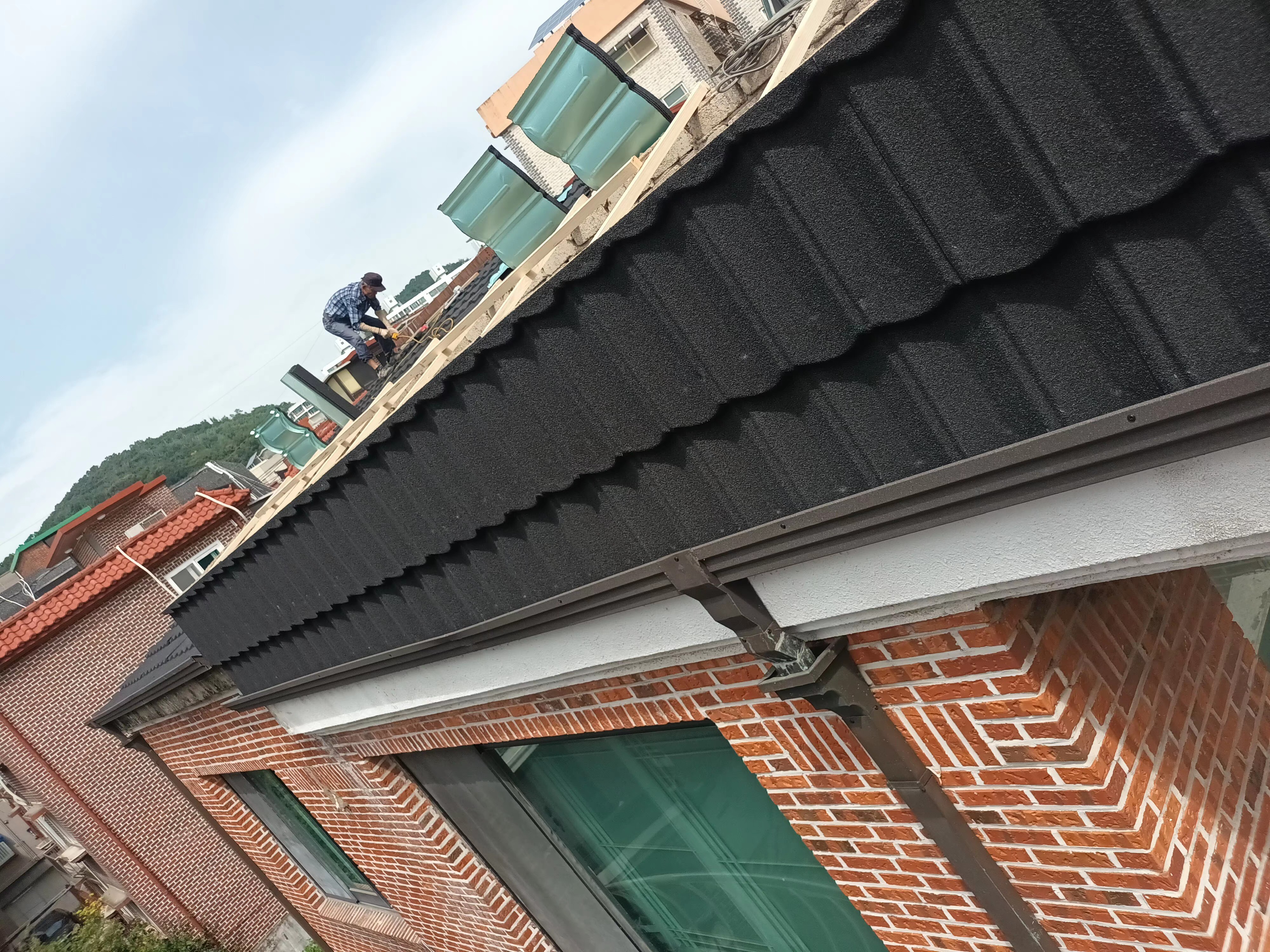 때문에 벽면 부분도 지붕공사 번위에 포함시켜 금속기와로 마감했습니다.