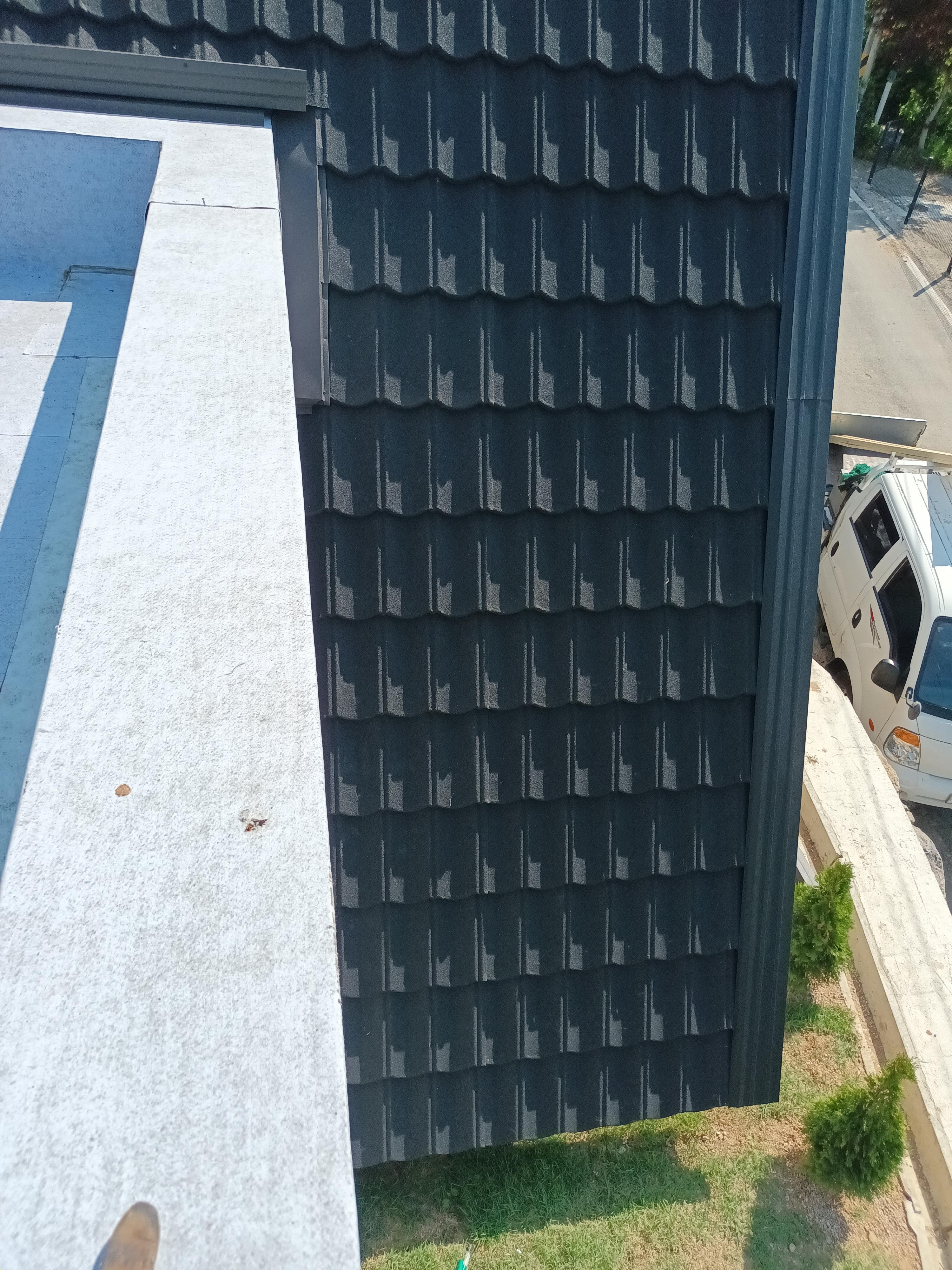 3. 각형 용마루 & 후레싱 마감 : 모던한 디자인을 살리기 위해 날렵한 각형 용마루를 사용하고, 사이드 라인은 후레싱 커버로 깔끔하게 처리했습니다.