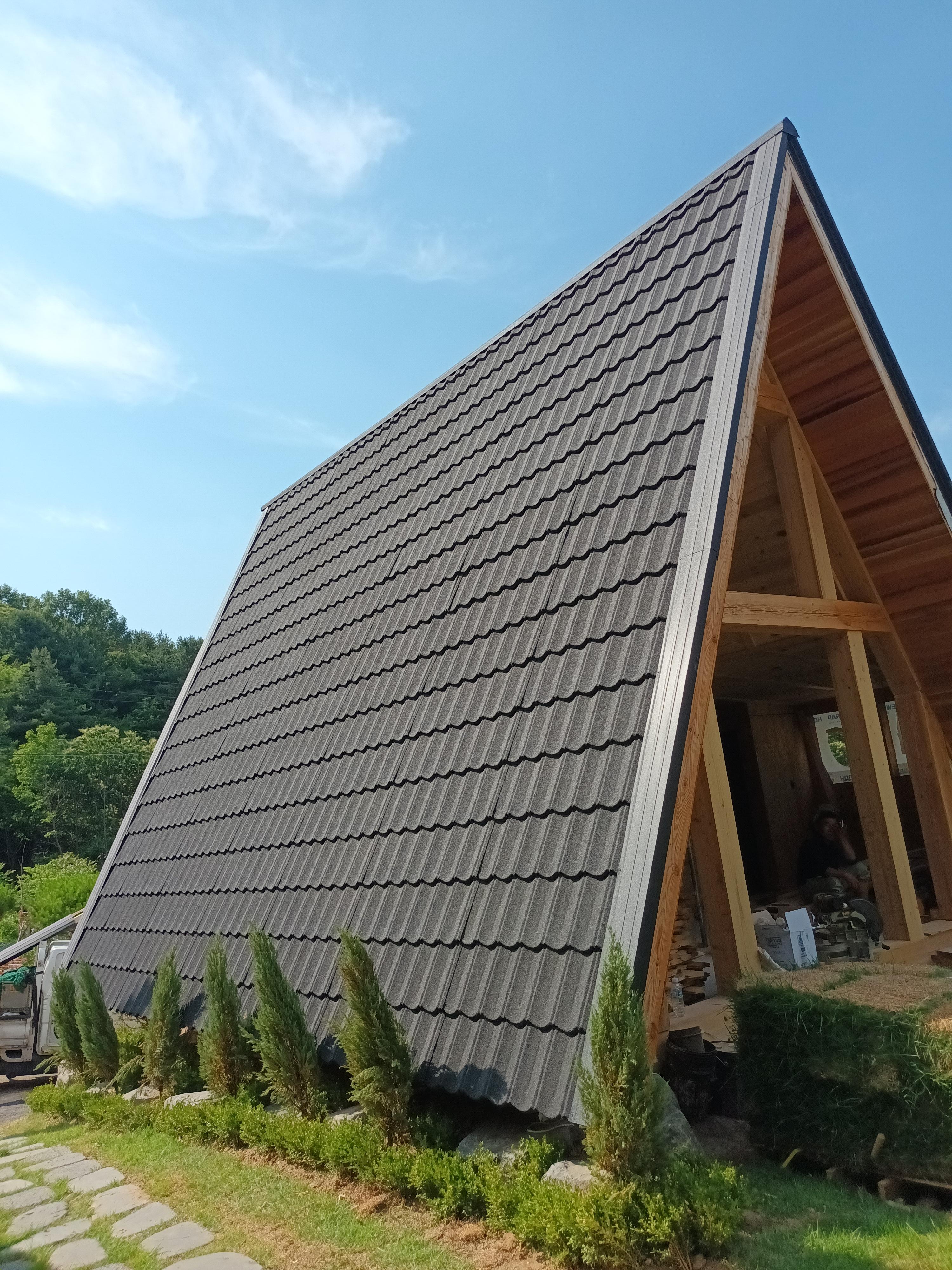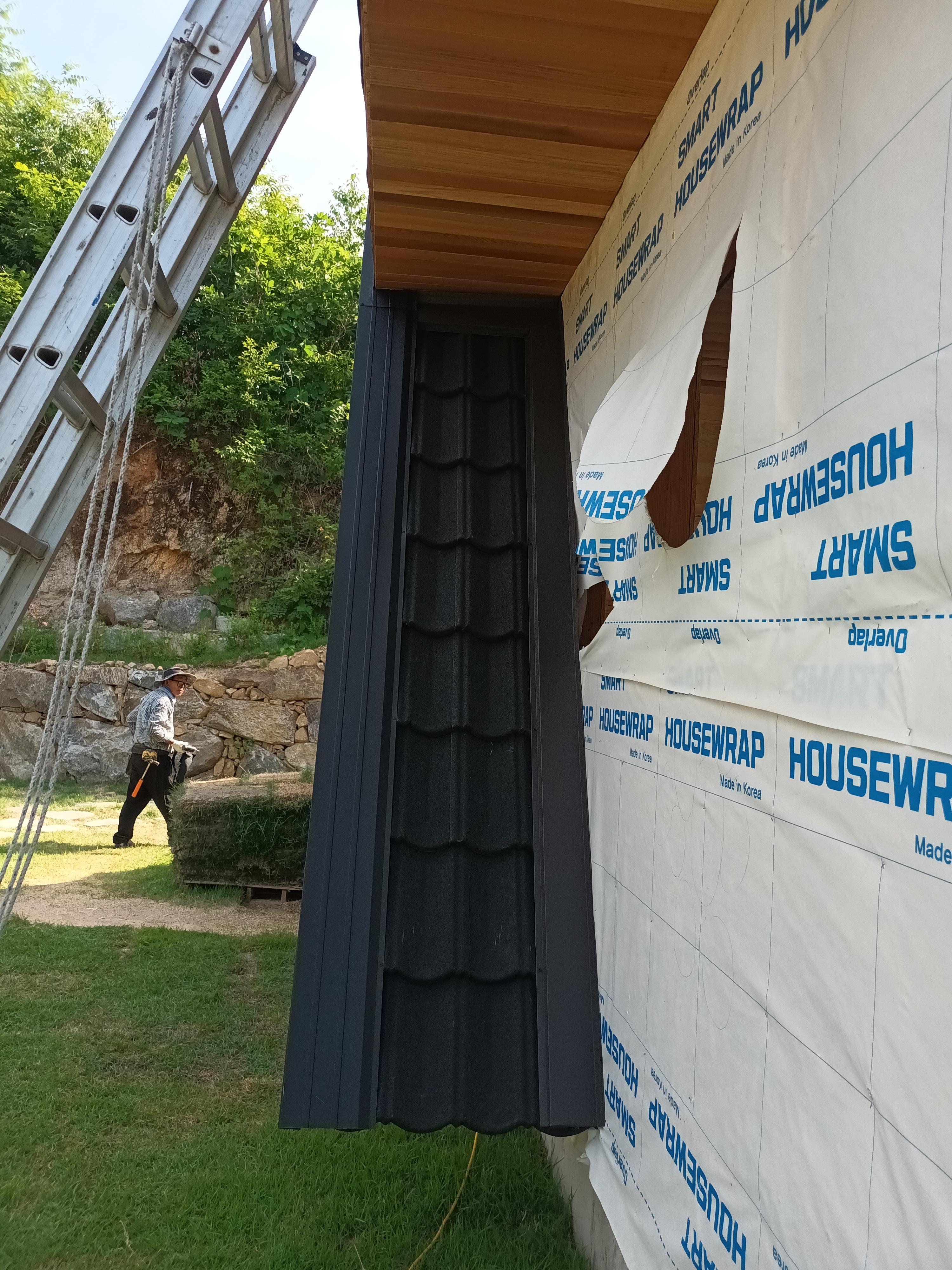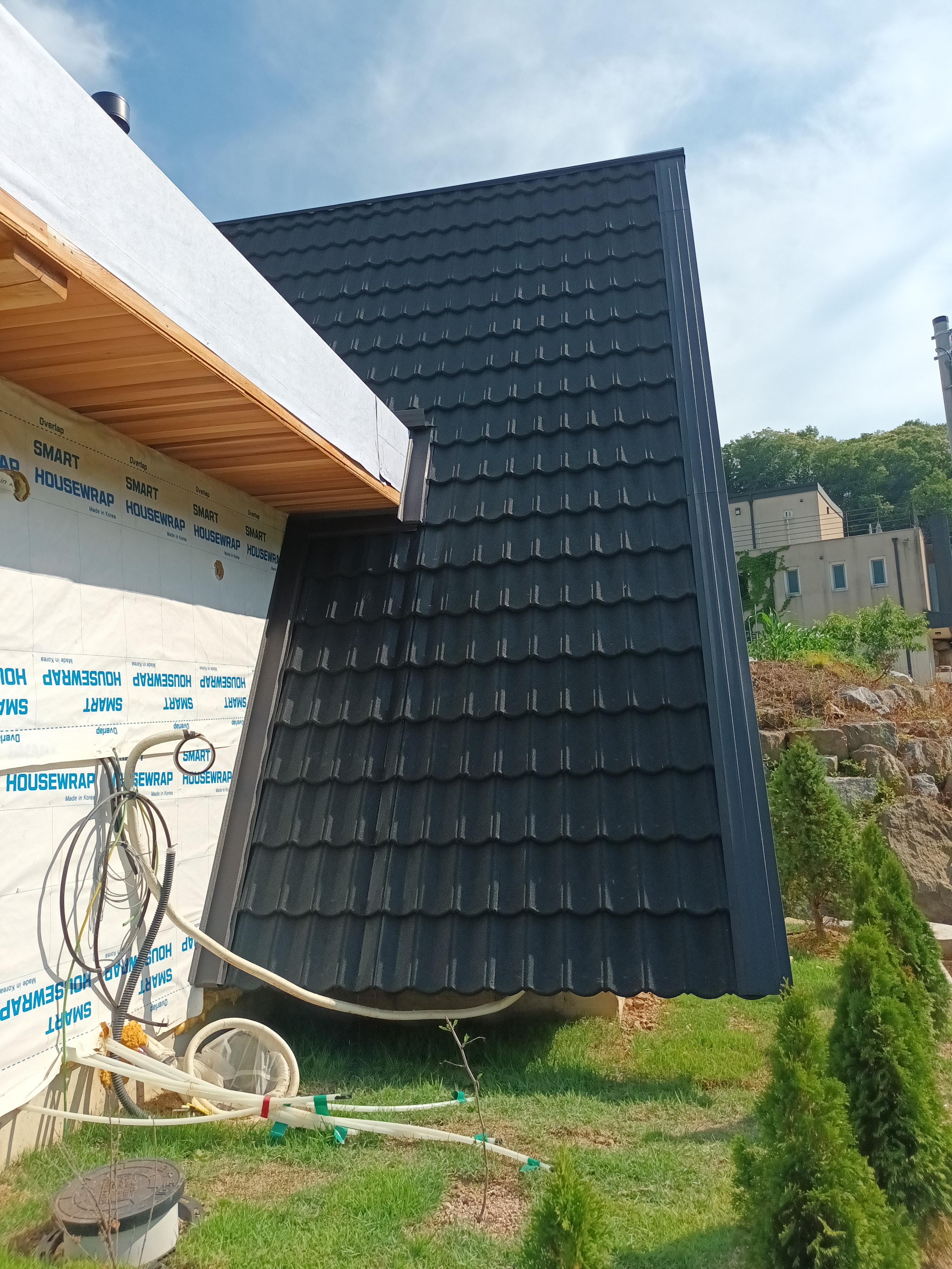 양평 목조주택 지붕공사엔 위 사진과 같이 금속기와로 지붕공사를 마무리 했습니다.